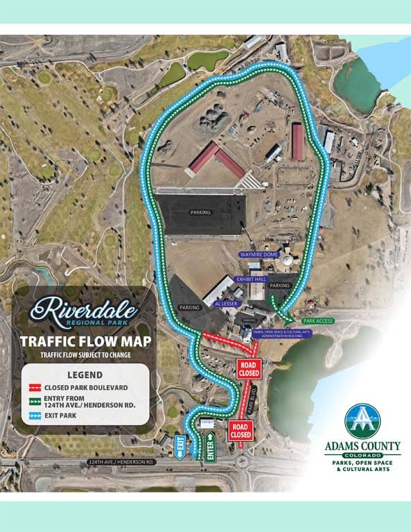 Entry and exit to the park will be through the Adams County Historical Society Museum entrance, just west of Park Boulevard from the roundabout. Just follow all the marked detours within the park (the green line on the map).